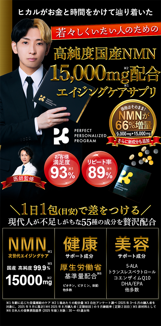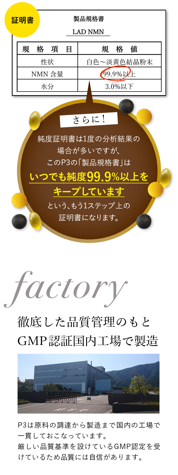 原料調達から検品まで厳しい品質基準を設けている国内の工場で、純度99.9%のNMNを使用し製造しております。