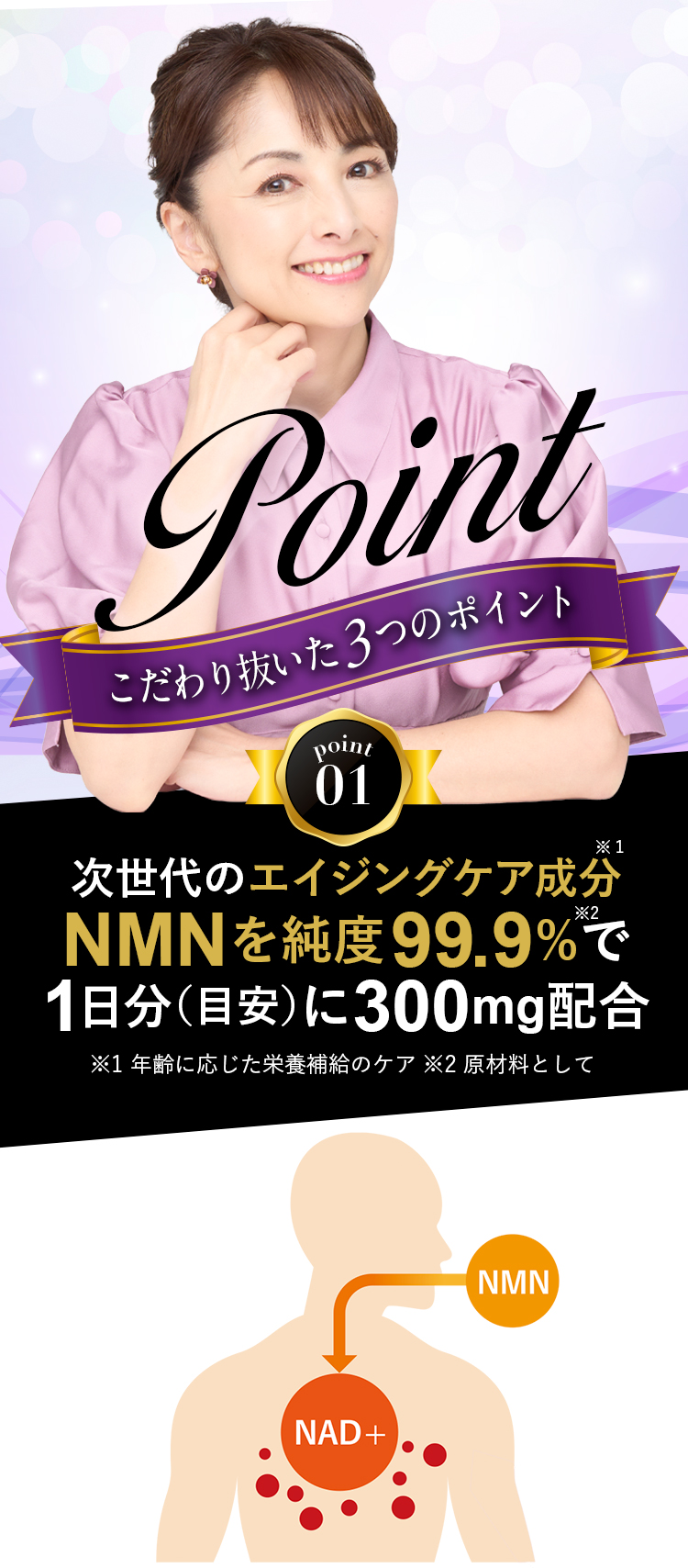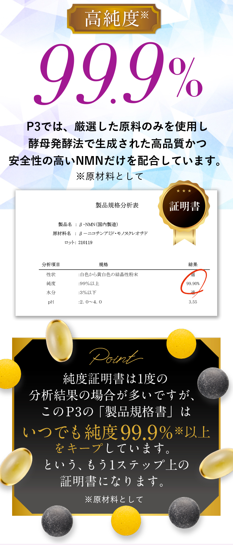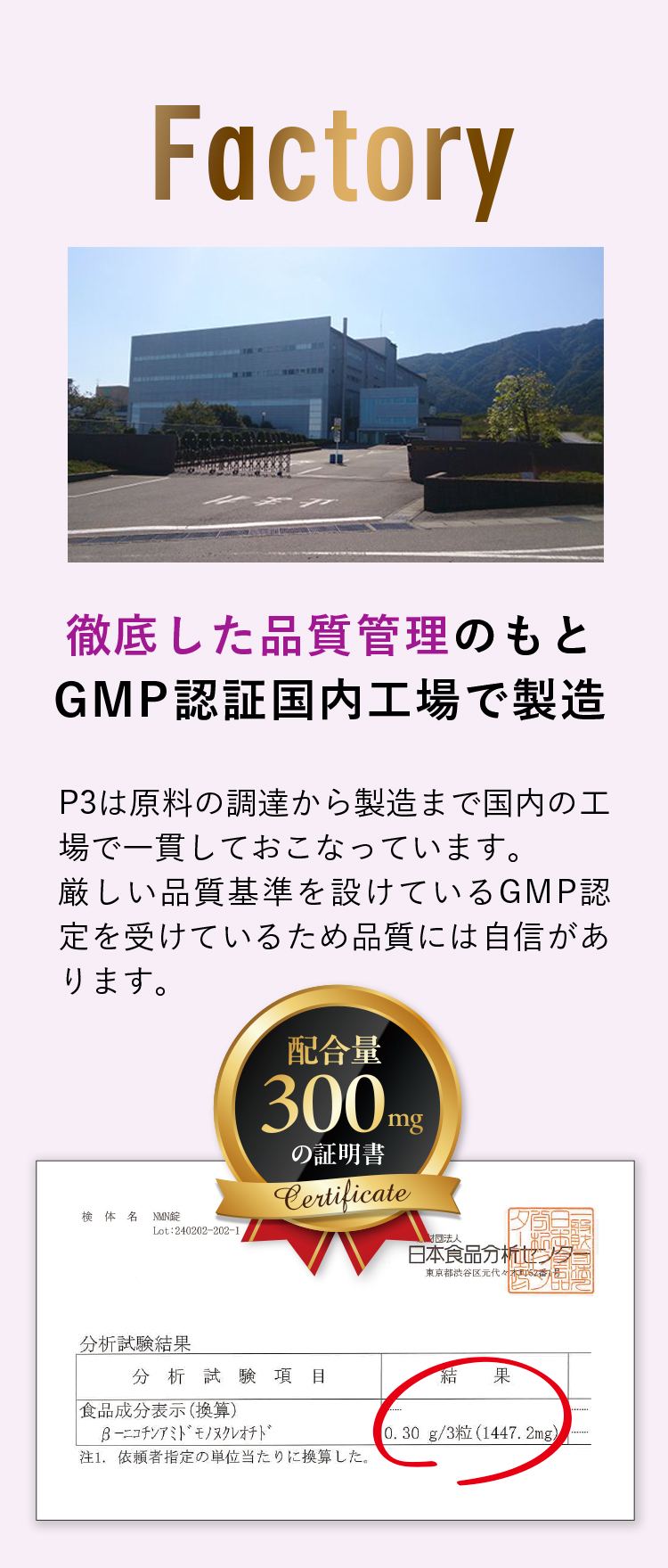 原料調達から検品まで厳しい品質基準を設けている国内の工場で、純度99.9%のNMNを使用し製造しております。