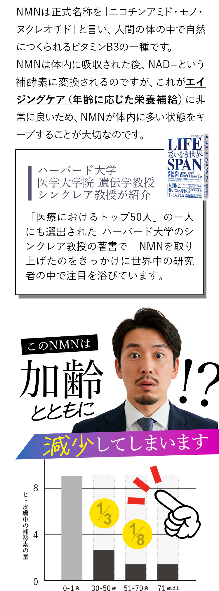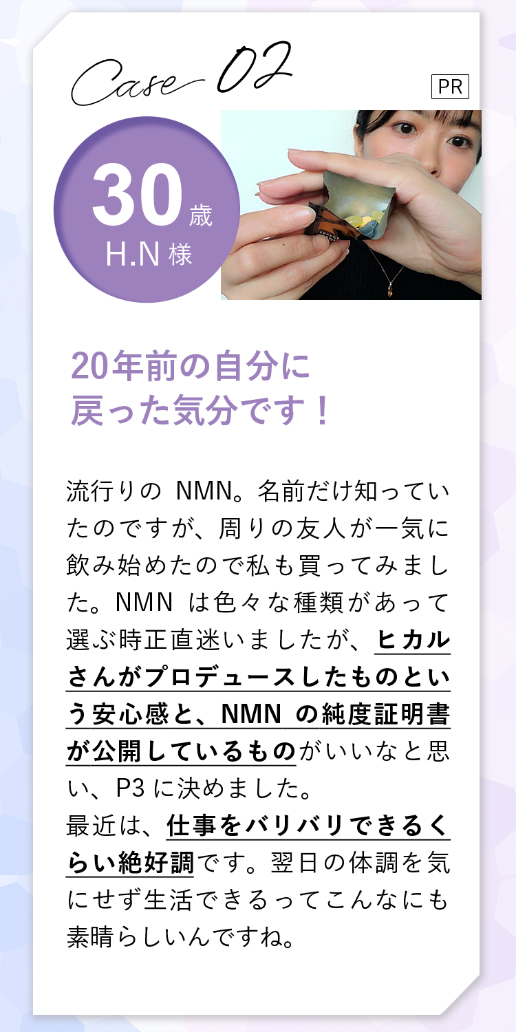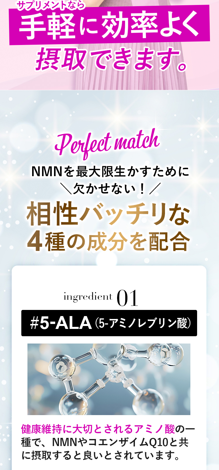原料調達から検品まで厳しい品質基準を設けている国内の工場で、純度99.9%のNMNを使用し製造しております。
