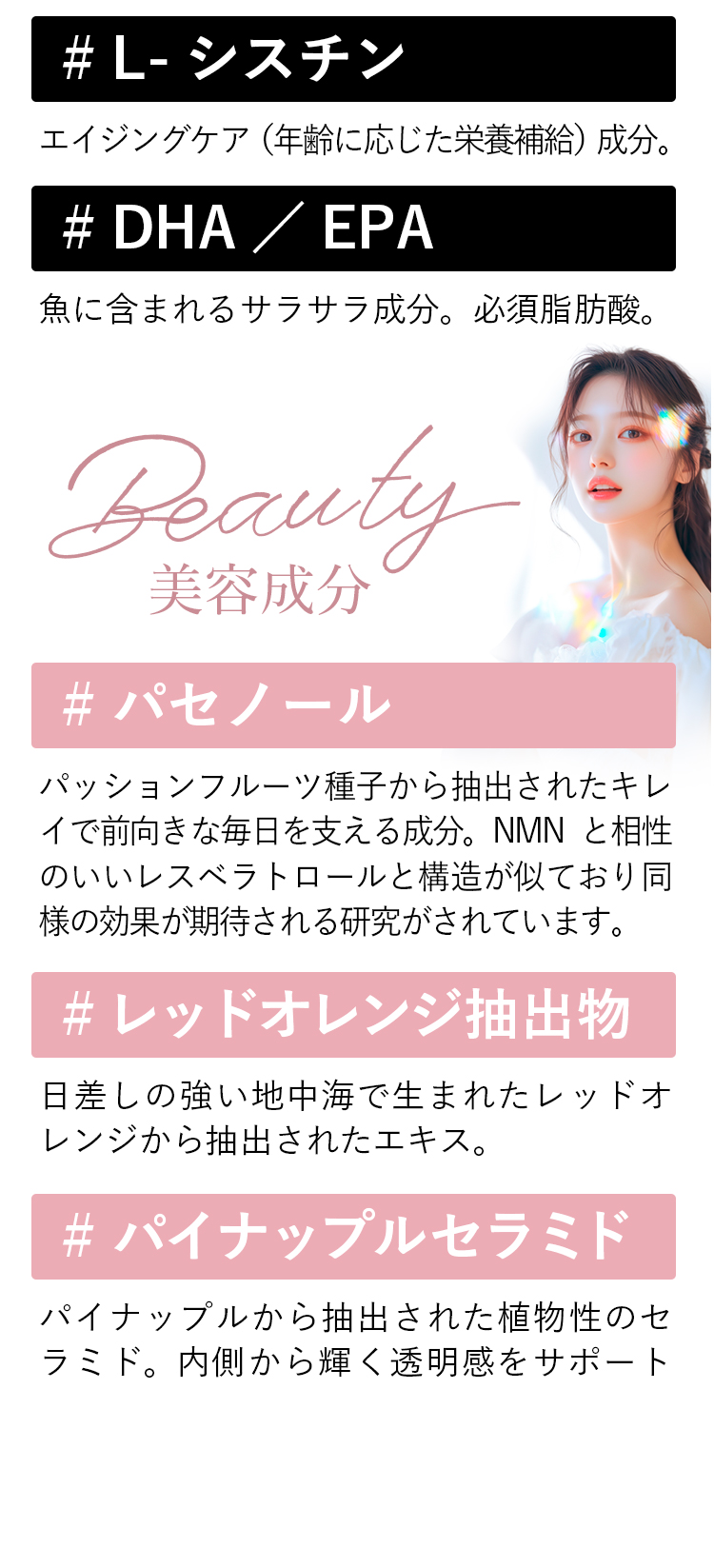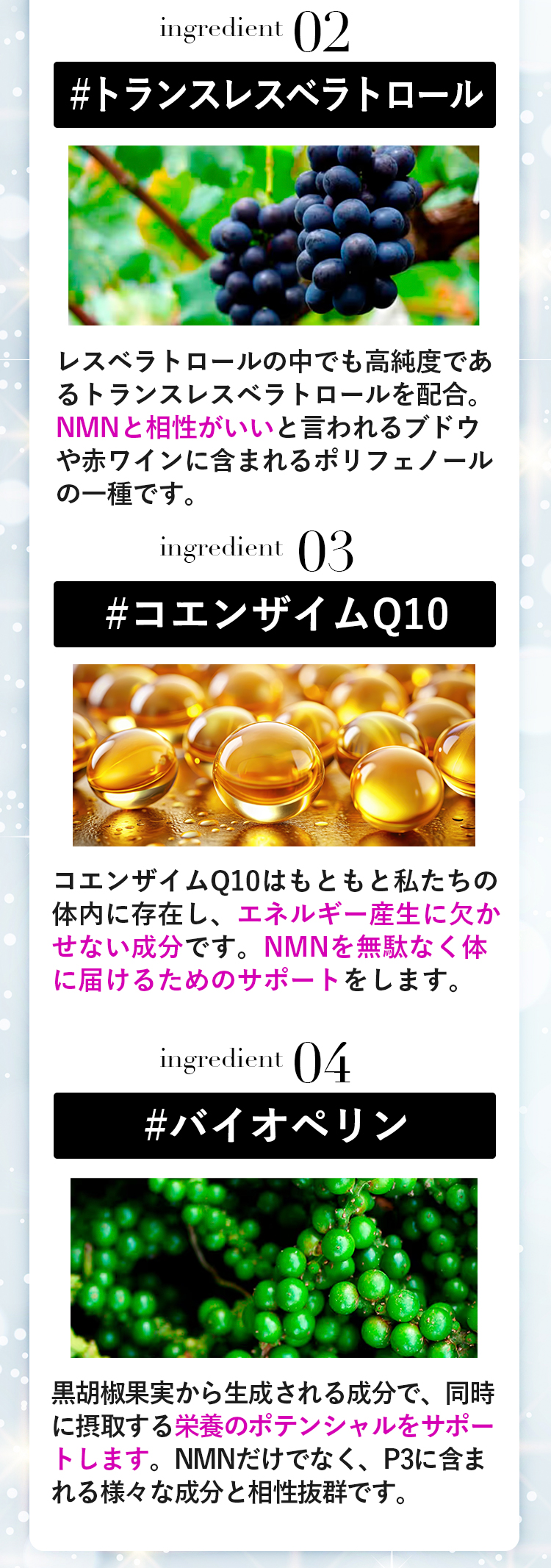 【黒色粒】β-ニコチンアミド・モノヌクレオチド(国内製造)、マルチトール、アミノ酸粉末(5-アミノレブリン酸含有)、黒コショウ抽出物、トランス-レスベラトロール、パッションフルーツ種子エキス末、GABA、乳酸菌粉末(殺菌)、にんにくエキス末、α-リポ酸、生姜末、レッドオレンジ抽出物、パイナップル果実抽出物/L-シスチン、ビタミンC、植物炭末色素、セルロース、ステアリン酸カルシウム、HPC、HPMC、微粒酸化ケイ素、セラック、CMC