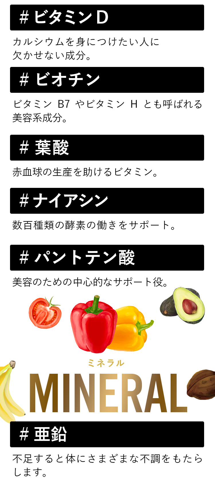 【黄色粒】還元パラチノース(国内製造)、亜鉛含有酵母、マンガン含有酵母、コエンザイムQ10、セレン含有酵母、モリブデン含有酵母、マルトデキストリン、クロム含有酵母、銅含有酵母/セルロース、HPC、加工デンプン、ステアリン酸カルシウム、ビタミンB₆、CMC、ビタミンB₂、微粒酸化ケイ素、ビタミンB₁、ナイアシン、パントテン酸カルシウム、セラック、L-アスパラギン酸ナトリウム、グリシン、L-アルギニン、アラニン、L-プロリン、L-セリン、L-チロシン、L-グルタミン酸、ピロリン酸鉄、葉酸、未焼成カルシウム、L-ロイシン、L-リジン塩酸塩、酸化マグネシウム、L-バリン、L-フェニルアラニン、L-イソロイシン、L-トレオニン、L-メチオニン、ビオチン、L-ヒスチジン、L-トリプトファン、ビタミンB₁₂