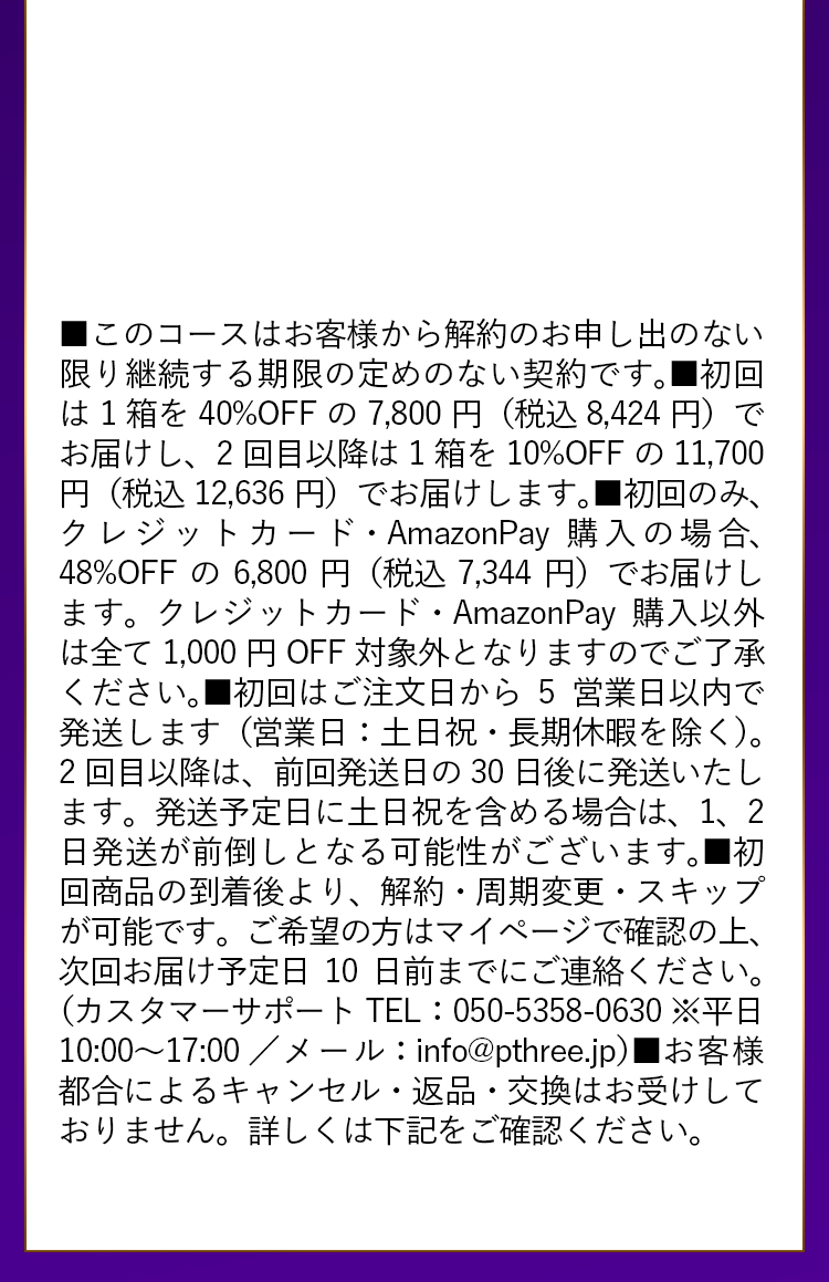 サプリメントなので即効性があるものではないため、まずは最低3ヶ月は継続してお召し上がりいただくことをおすすめしております。モニター様からも3ヶ月以上続けていただいた方から嬉しいお声をいただいております。
