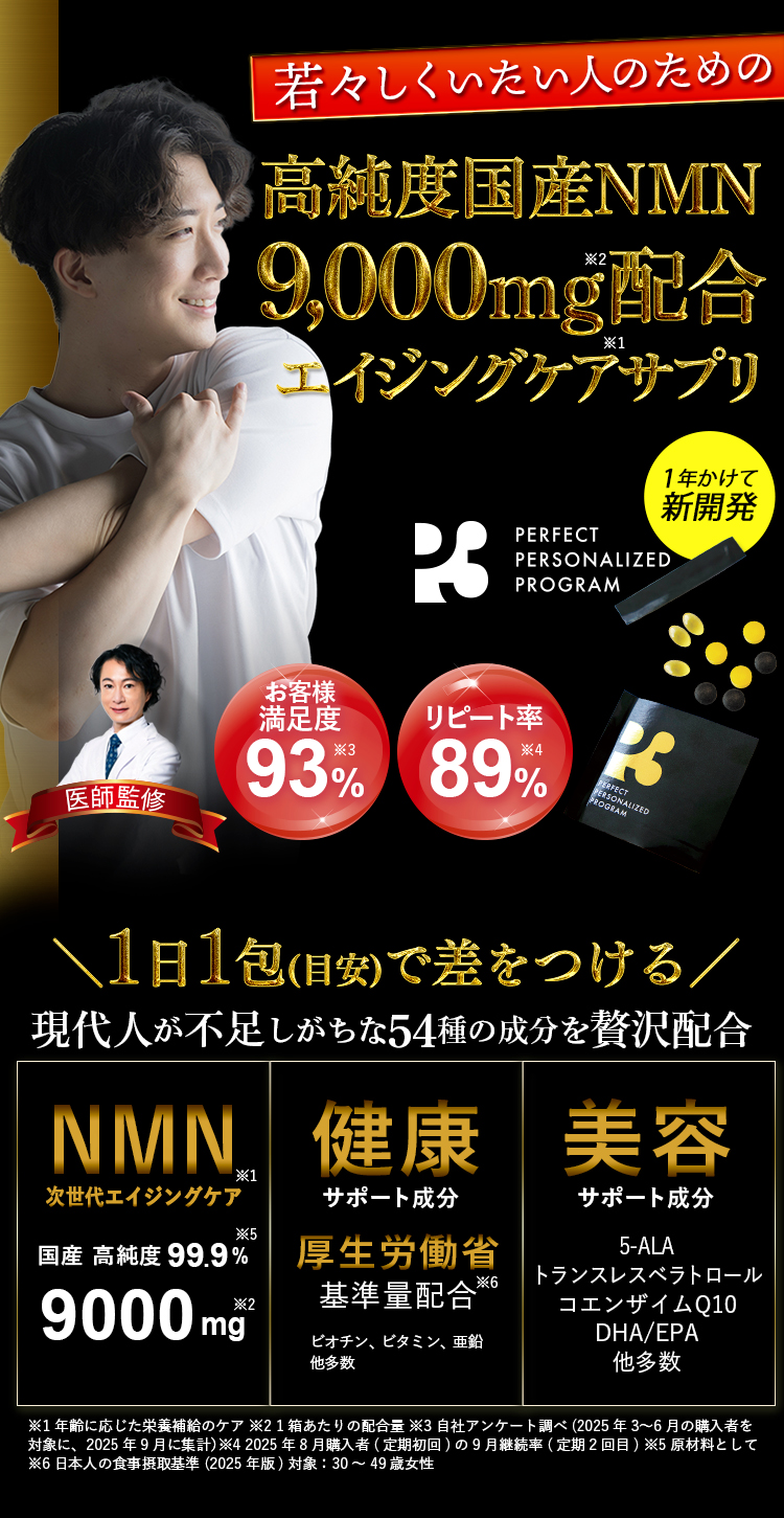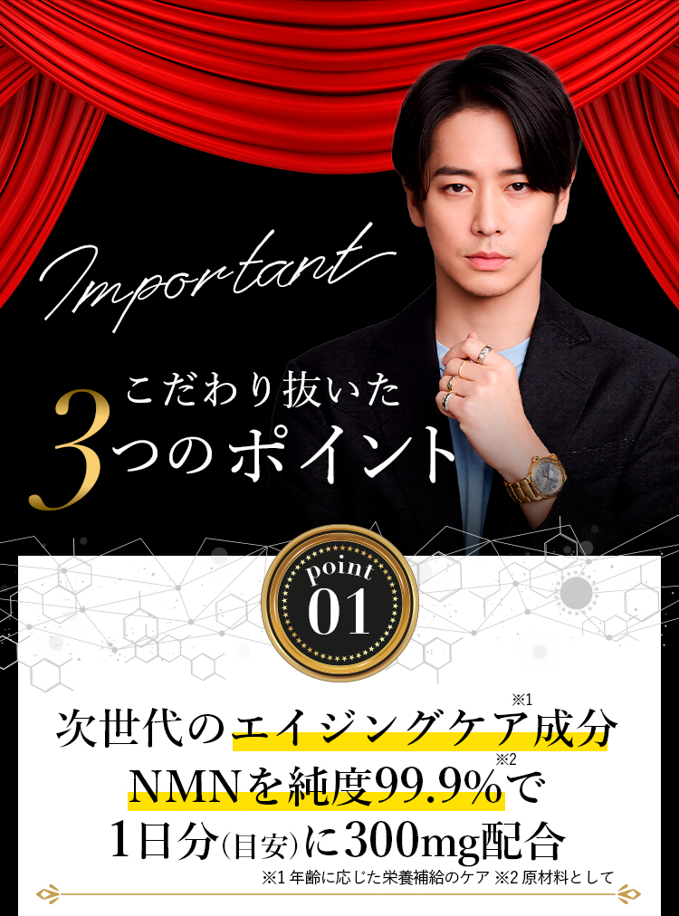 原料調達から検品まで厳しい品質基準を設けている国内の工場で、純度99.9%のNMNを使用し製造しております。