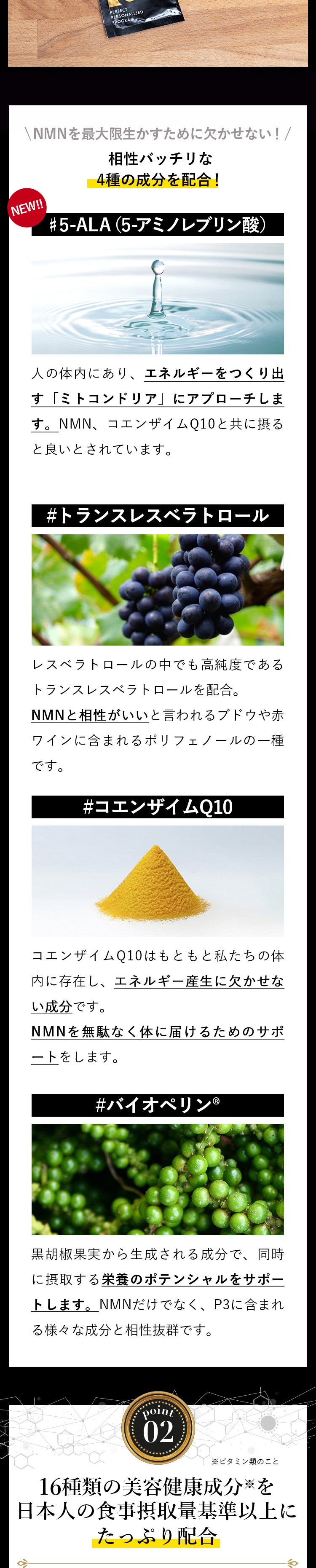 【黒色粒】β-ニコチンアミド・モノヌクレオチド(国内製造)、マルチトール、アミノ酸粉末(5-アミノレブリン酸含有)、黒コショウ抽出物、トランス-レスベラトロール、パッションフルーツ種子エキス末、GABA、乳酸菌粉末(殺菌)、にんにくエキス末、α-リポ酸、生姜末、レッドオレンジ抽出物、パイナップル果実抽出物/L-シスチン、ビタミンC、植物炭末色素、セルロース、ステアリン酸カルシウム、HPC、HPMC、微粒酸化ケイ素、セラック、CMC